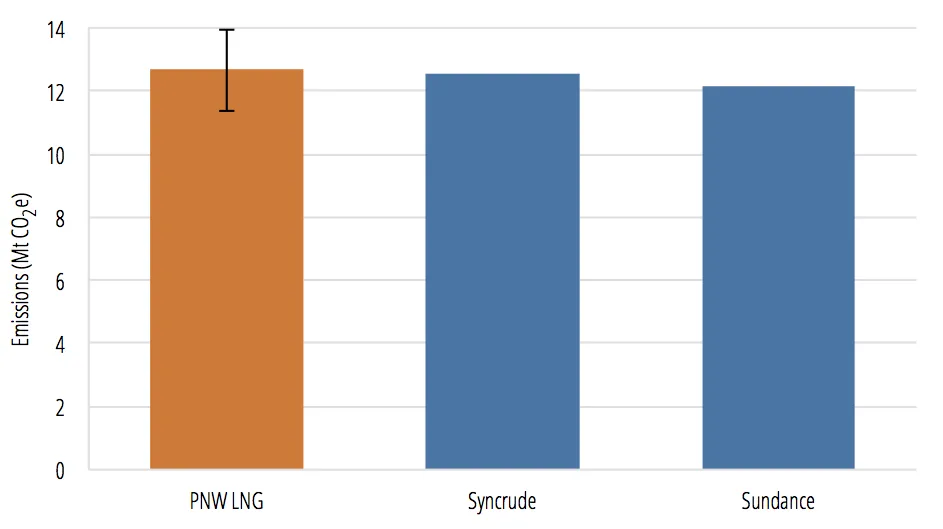 - The annual carbon pollution from the Pacific NorthWest LNG project and its associated upstream operations is estimated at 11.5 to 14.0 megatonnes of carbon dioxide equivalent. Canada’s top two carbon polluters are Syncrude’s oil sands mine and upgrader and the Sundance coal fired power plant — at 12.5 and 12.2 megatonnes, respectively.