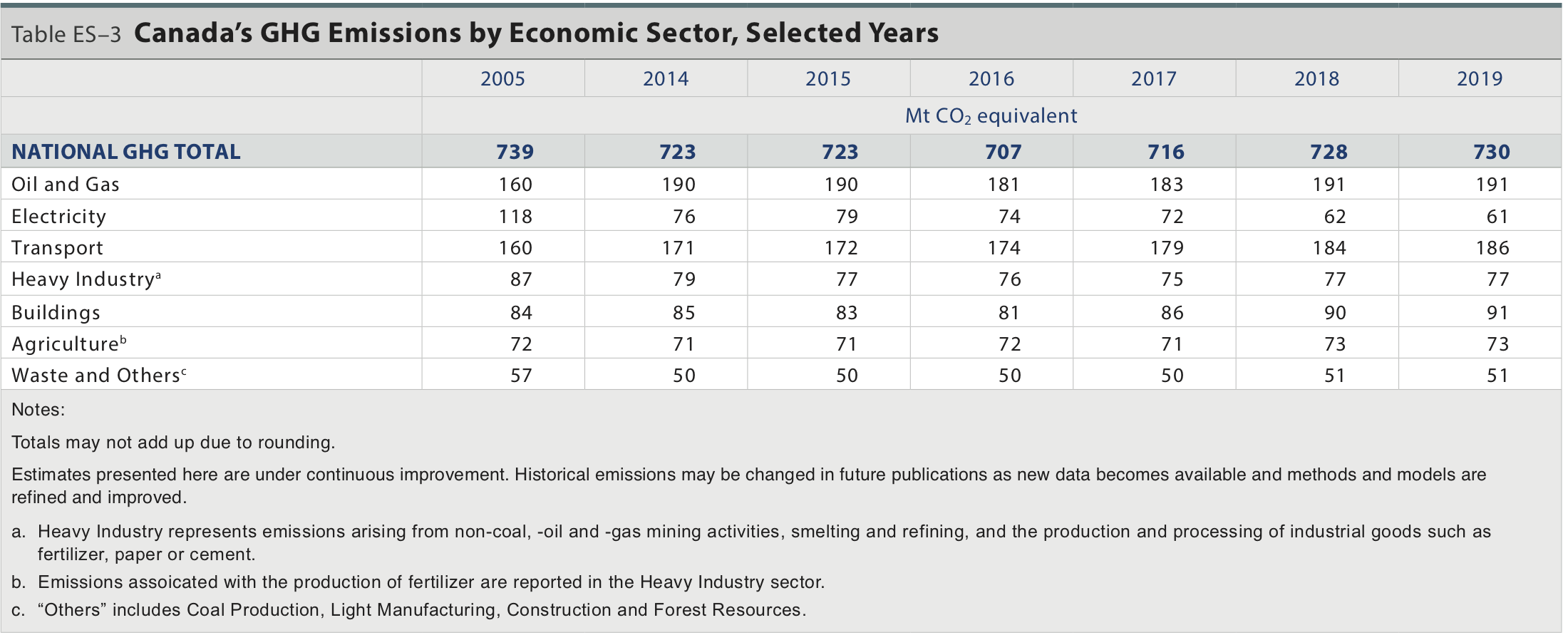 Greenhouse gas trends since 2005 have remained steady. Increases in the oil and gas (up by 31 megatonnes or 20 per cent) and transport (up by 26 megatonnes or 16 per cent) sectors have been mostly offset by decreases in other sectors, especially electricity (down 57 megatonnes or 48 per cent) and heavy industry (down 10 megatonnes or 11 per cent).