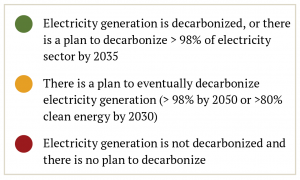 The second step involved compiling and refining the list of indicators to eliminate overlap and redundancy. With input from subject matter experts, a rating system was developed to measure the degree to which each of the criteria were met. For some criteria, the rating system is a binary yes/no or increasing or decreasing rating, and for other criteria a three-tier rating system is used with a green indicating fully meeting or exceeding the criterion, yellow indicating somewhat meeting the criterion, and red meaning not meeting the criterion. For some indicators, major findings of the International Energy Agency’s recent report outlining a path to net-zero emissions were used to determine evaluation criteria.