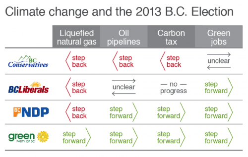 To help clarify the differences between the four main parties’ positions on climate, we looked at the following four election issues with implications for climate change and the province’s ability to meet its greenhouse gas (GHG) reduction targets: liquefied natural gas (LNG), oil pipelines, the carbon tax and green jobs. Coal exports could have been a fifth category, but party positions on it haven’t been clear enough to make a meaningful assessment.