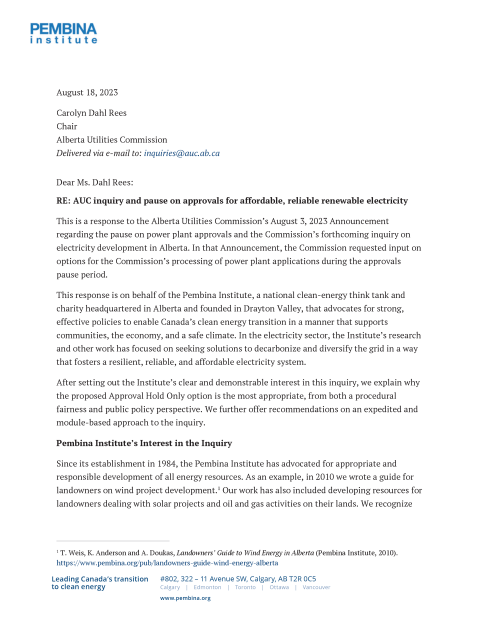 The Pembina Institute submitted its response to the Commission's inquiry. We recommend that the pause be lifted and that the government (including the Commission and the Ministry of Affordability and Utilities) address concerns through existing regulatory processes and ongoing policy development.